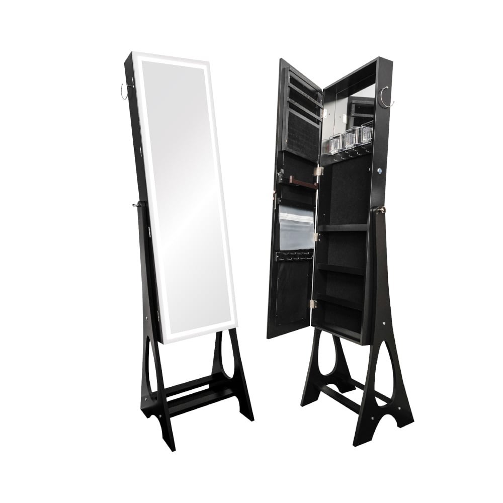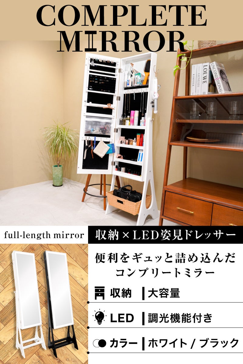 アクセサリーや小物を整理して収納できLEDでメイクもできる収納付き全身ミラー