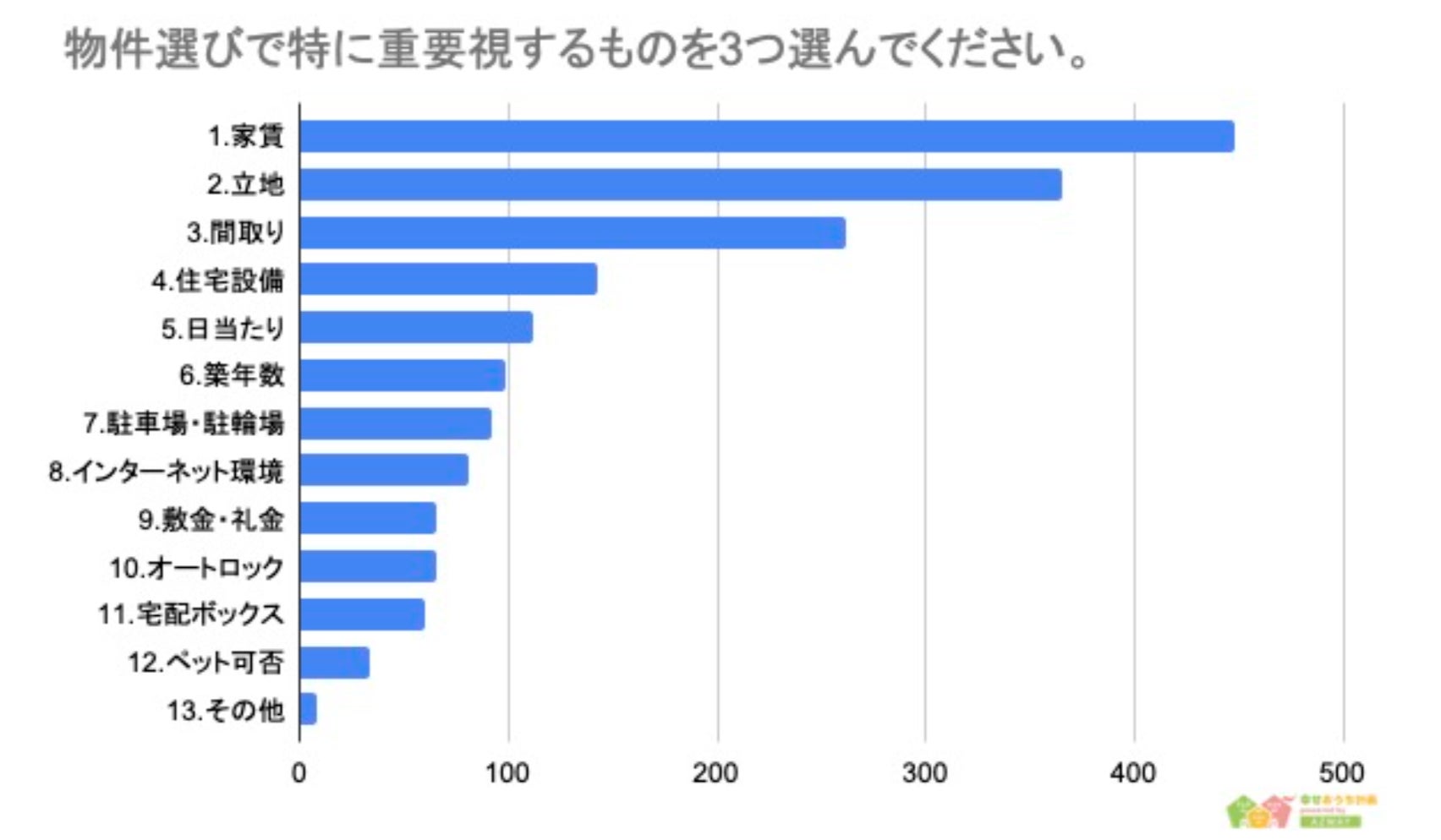 最後に「物件選びで特に重要視するもの」について聞いたところ、1位が「家賃(448票)」、2位が「立地(365票)」、3位が「間取り(262票)」という結果に。他には「住宅設備」や「日当たり」が上位に入っており、日々の生活に直接関わってくるものが上位にランクインしていることがわかります。