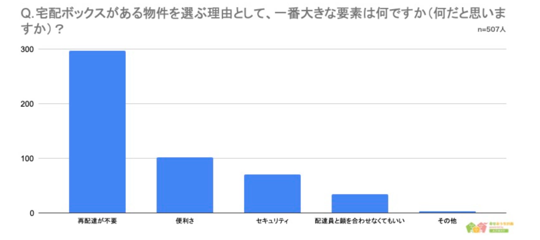 続いて、「宅配ボックスがある物件を選ぶ理由として1番大きな要素」について聞いたところ、1位が「再配達が不要(298人)」、2位が「便利さ(102人)」、3位が「セキュリティ」という結果に。不在でも荷物が届くため、再配達が不要になる点に魅力を感じている人が多いことがわかります。