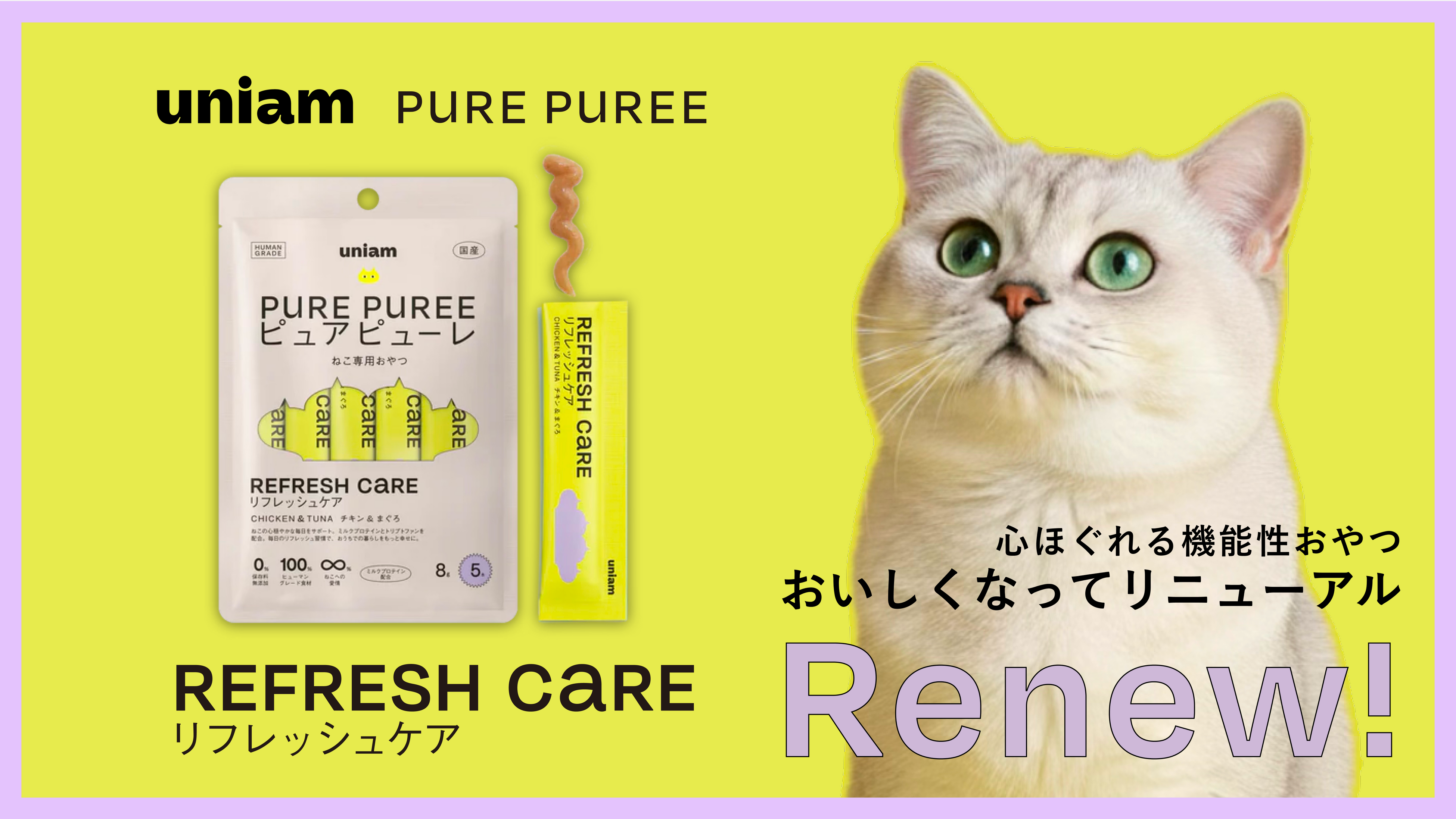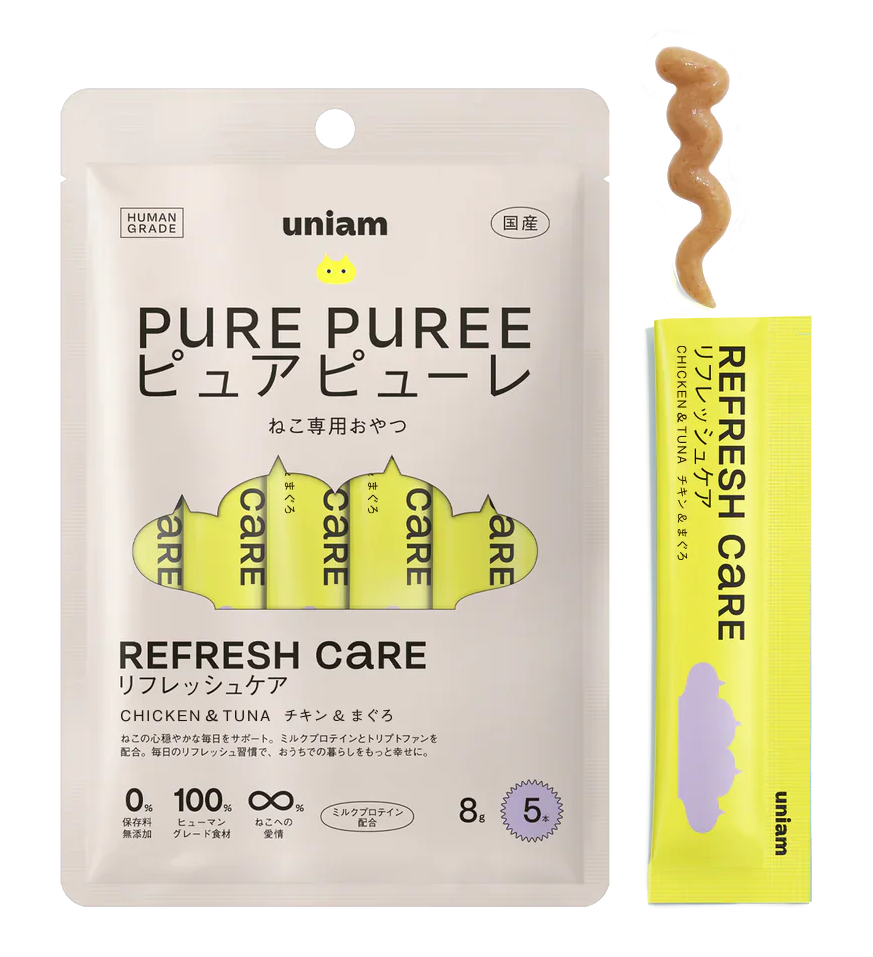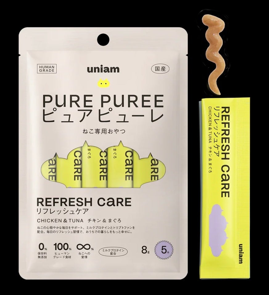 「ねこと生きるを、ユニークに。」をパーパスに掲げ、ねこ特化型ヘルスケアブランドを展開する株式会社uniam(本社:東京都港区、代表取締役CEO:杉本亜衣、以下当社)は、健康ケアに特化したねこ用おやつ「ピュアピューレ」シリーズの「リフレッシュケア」のレシピをリニューアルします。