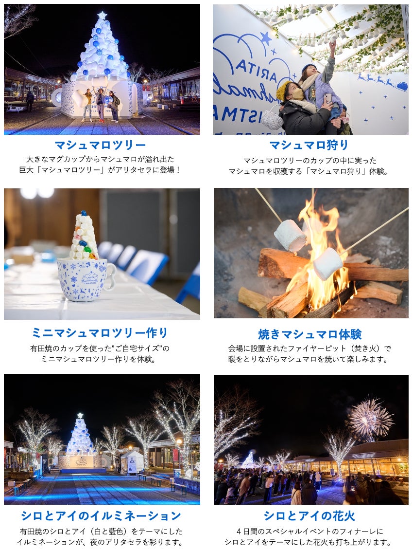 有田焼とマシュマロを楽しむ、アリタだけの特別なクリスマスイベント「アリタ・マシュマロ・クリスマス」は、1万球増加してより輝きを増した「シロとアイのイルミネーション」、昨年大好評だった「マシュマロ狩り」、昨年より打ち上げ数が増加した「シロとアイの花火」など、今年もよりたくさんの美味しいと楽しいを用意して、皆様のご来場をお待ちしています。