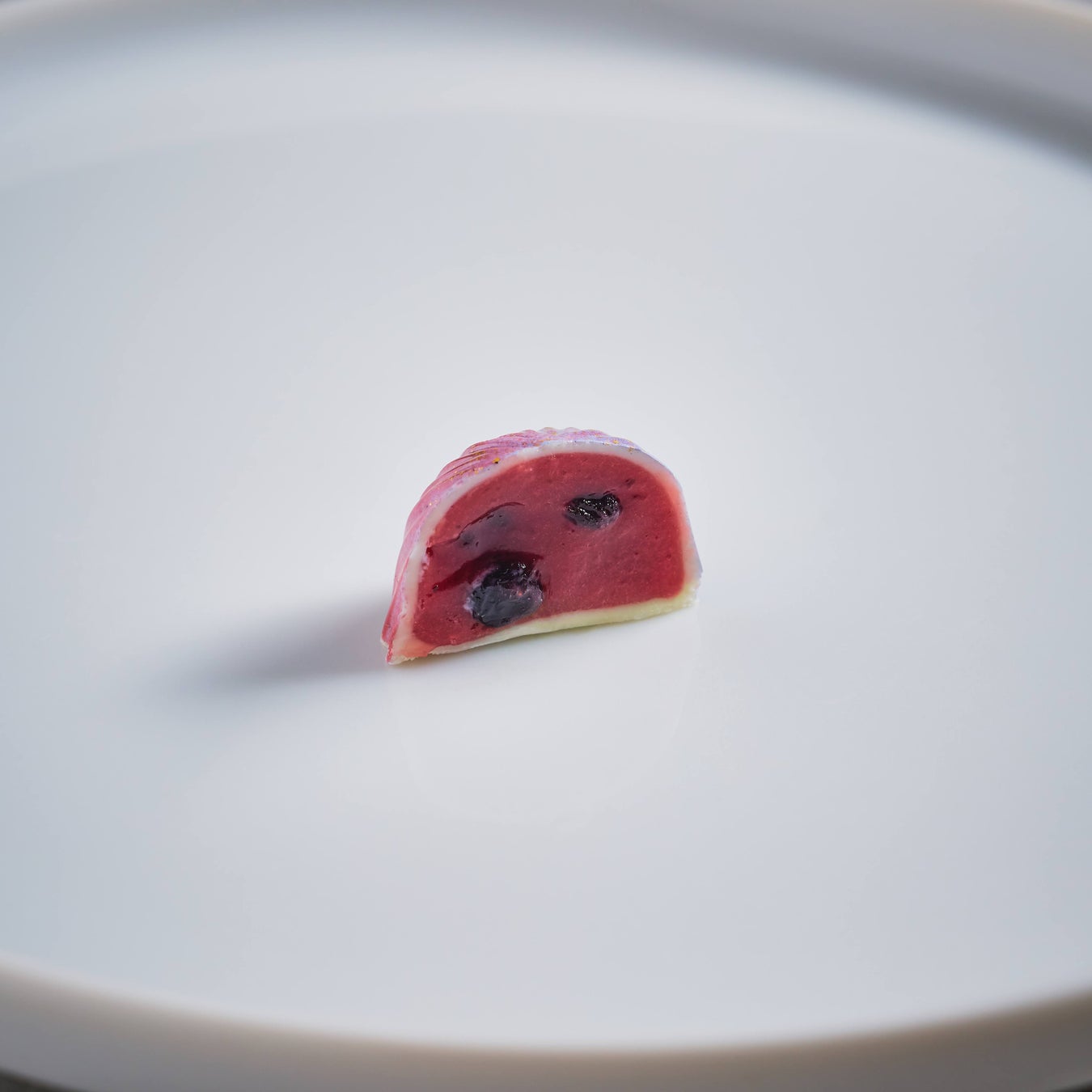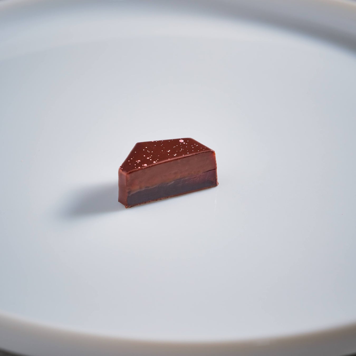 桜で香りづけしたカカオ39%のショコラ オ レと凝縮したライチ果汁のパート・ドゥ・フリュイを2層に重ねました。