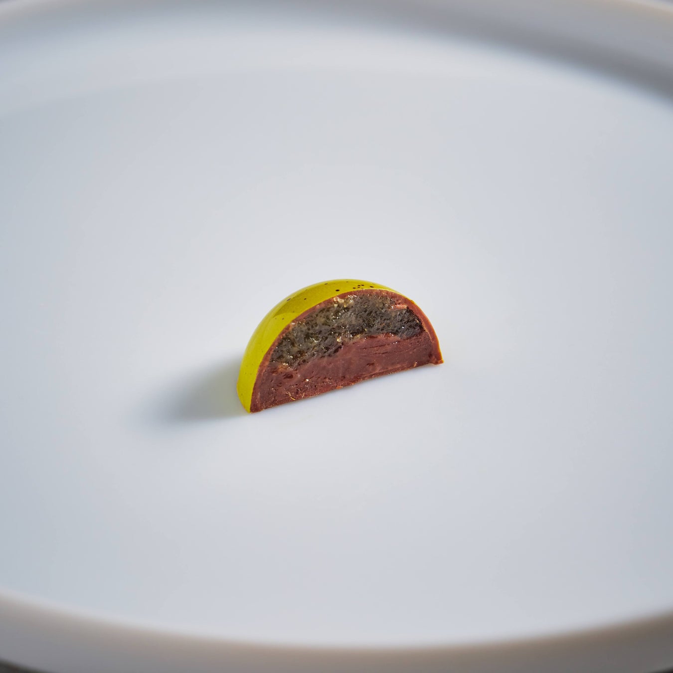 フルーティーな香りのダージリンを加えたショコラ オ レガナッシュとキウイのパート・ドゥ・フリュイ、2層仕立てのボンボンショコラ