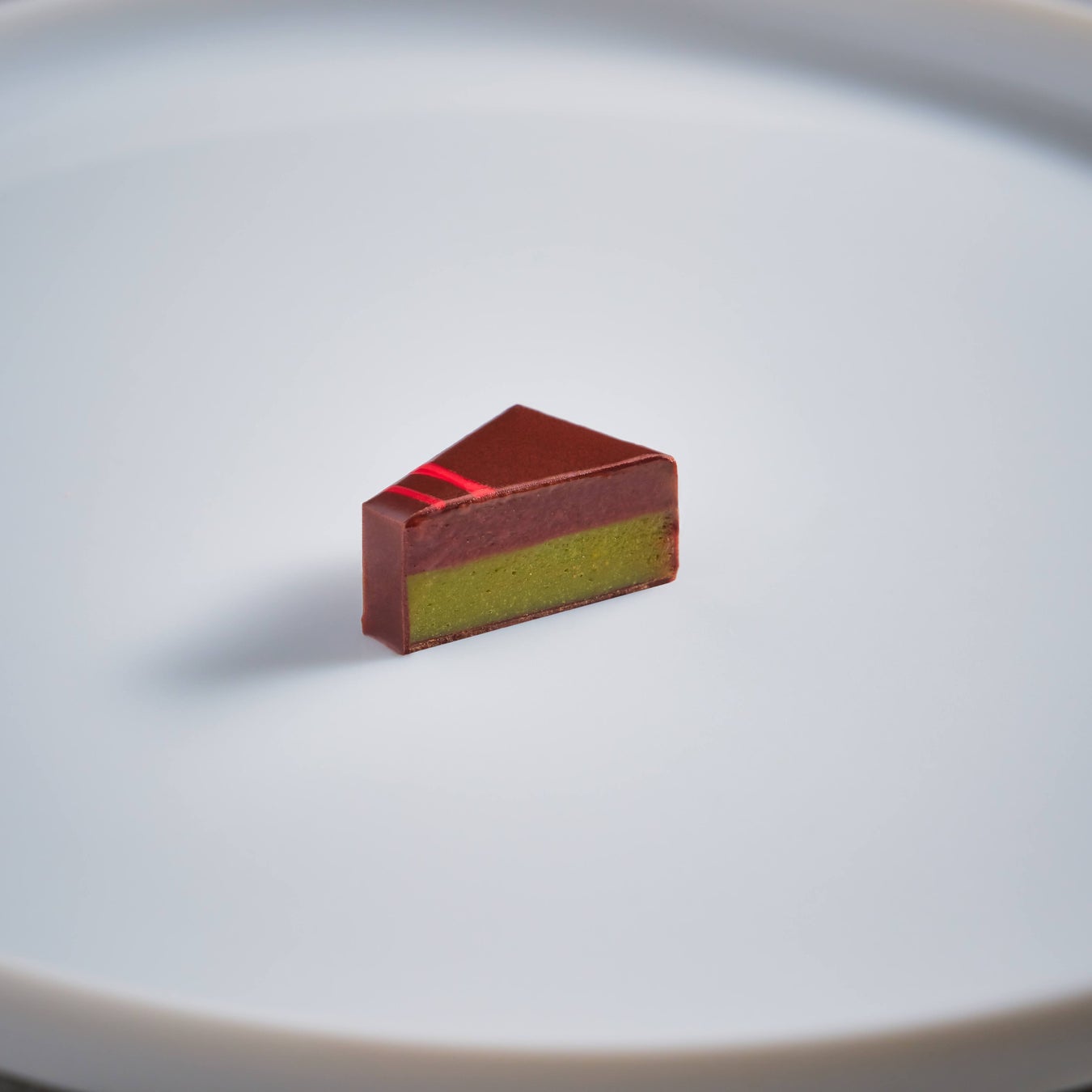 糖度が高くジューシーなあまおう苺を使い、果実味を感じられるフレッシュなガナッシュと香り高く濃厚なピスタチオ。お互いの味わいを引き立てる相性の良い組み合わせ。