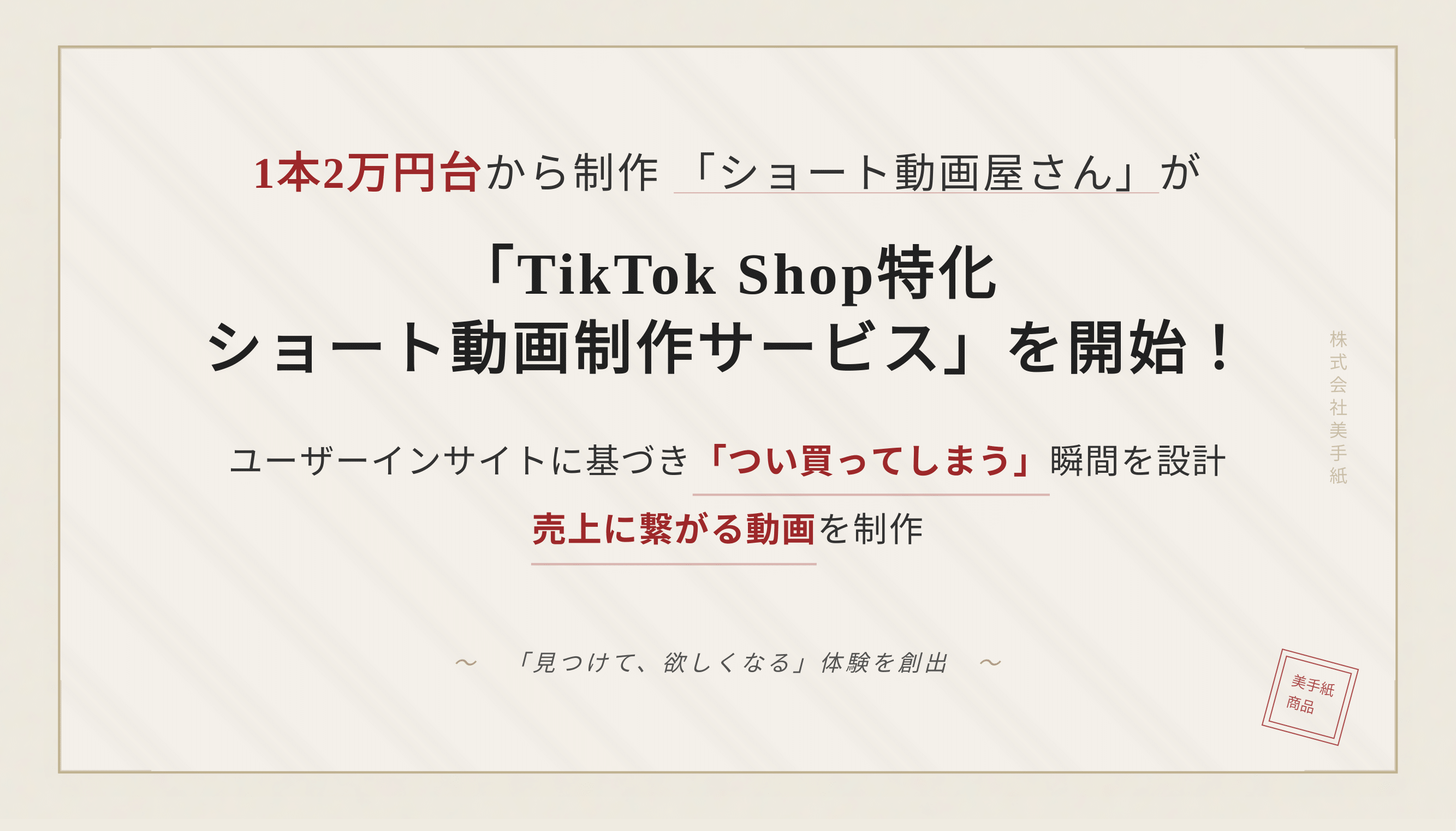 株式会社美手紙(本社:東京都港区、代表取締役:池田光)が運営する「ショート動画屋さん」は、「TikTok Shop等ライブ活用ショート動画制作サービス」を開始することをお知らせいたします。