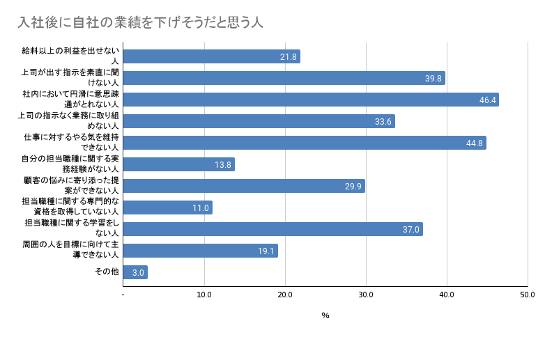 ・採用段階での見極めが不十分であること ・モチベーションが維持できないこと ・採用基準が明確でない ・優秀な人材が他社に流れている |