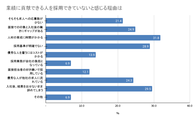 今回の調査で明らかになったのは、約4割の担当者が「自社の業績に貢献できる人材が採用できていない」と感じていること。