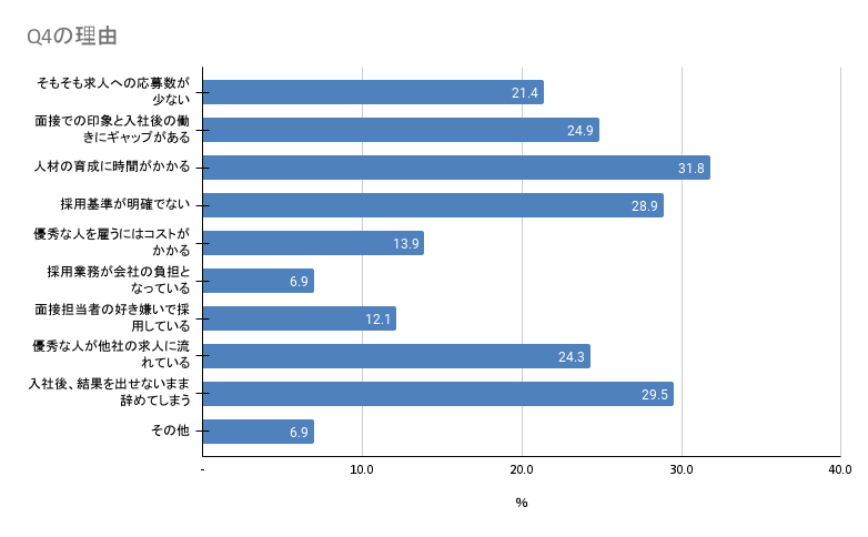 その理由を分析すると「育成にかかる時間」「辞めてしまう」「採用基準の不明瞭さ」「応募数」など様々な採用〜教育のプロセスに問題を感じていることが伺えます。