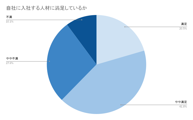 やや不満、不満を合わせると37%以上の人事、採用、教育担当者の方が自社に入社する人材に不満を抱えているという状況。
