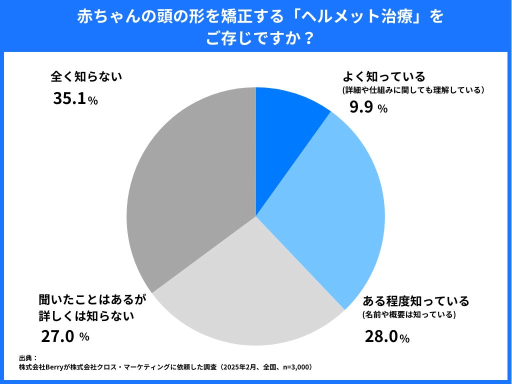 赤ちゃんの頭の形を矯正する「ヘルメット治療」について、「よく知っている(9.9%)」「ある程度知っている(28.0%)」と答えた方は合計37.9%で、約4割がヘルメット治療を認知していることが分かりました。一方で、「聞いたことはあるが詳しくは知らない(27.0%)」「全く知らない(35.1%)」でした。