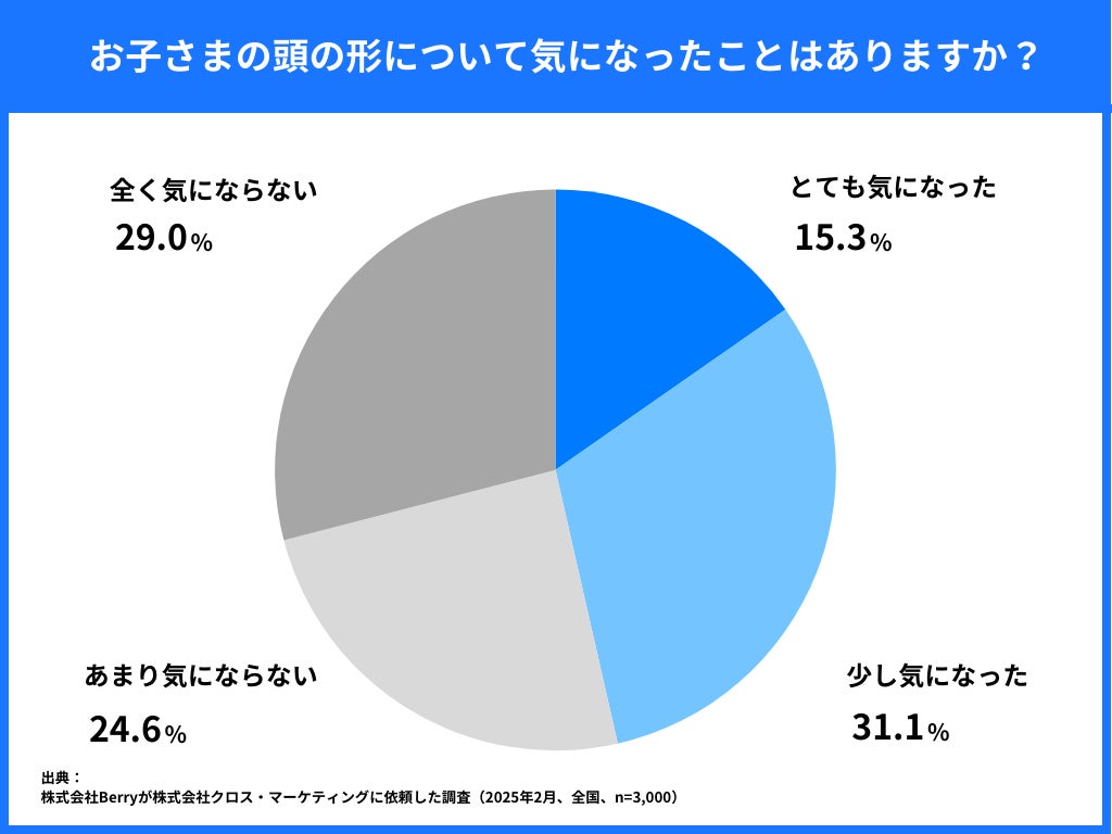 「お子さまの頭の形について気になったことはありますか?」という質問に対し、15.3%の保護者が「とても気になった」、31.1%が「少し気になった」と回答しました。合計すると46.4%の保護者が赤ちゃんの頭の形について関心を持っていることが分かりました。