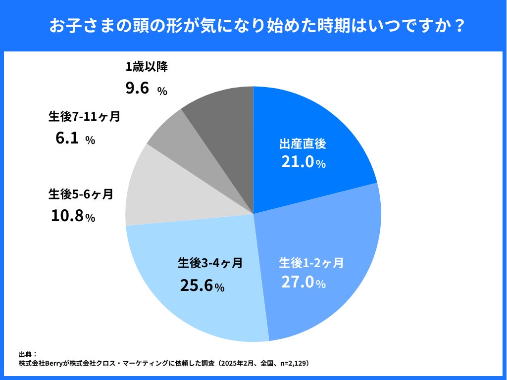 「お子さまの頭の形が気になり始めた時期はいつですか?」という質問では、「出産直後(21.0%)」「生後1〜2ヶ月(27.0%)」「生後3〜4ヶ月(25.6%)」と、約7割が生後4ヶ月までに頭の形に気になり始めていることが明らかになりました。