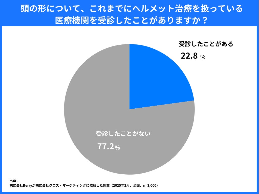 「赤ちゃんの頭の形について、これまでにヘルメット治療を扱っている医療機関を受診したことがありますか?」という質問に対し、「受診したことがある」と答えた方はわずか22.8%でした。一方で「受診したことがない」と答えた人は77.2%にのぼり、多くの方が赤ちゃんの頭の形を気にしつつも受診に至らないことが分かりました。