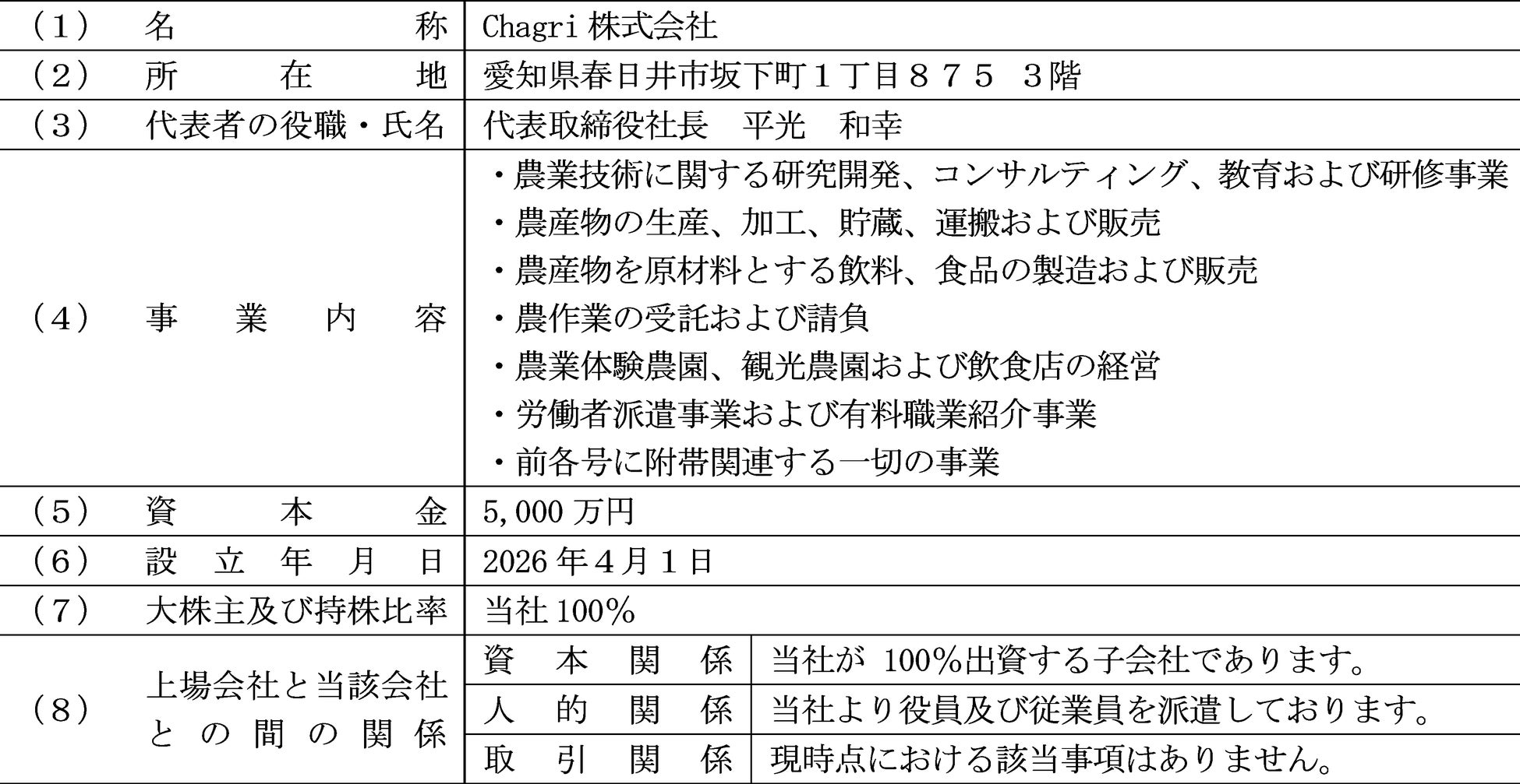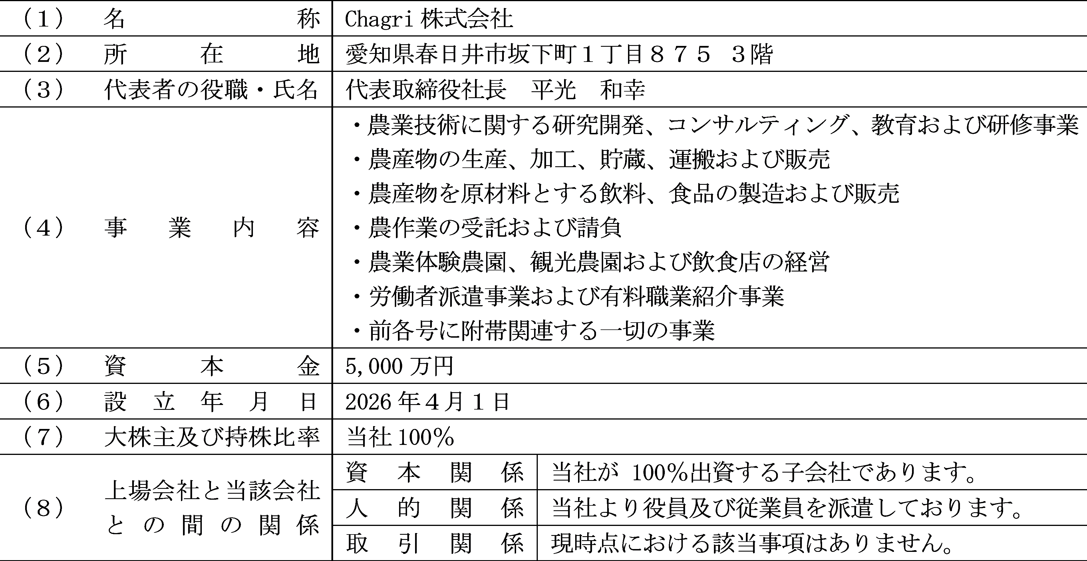 今回、新たに子会社を設立し、当社グループの新規事業領域である抹茶関連分野において、抹茶の原材料である碾茶の生産現場における課題の解決を図るとともに、市場拡大に対応した供給体制の構築を目的としております。