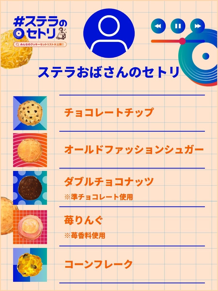 ステラおばさんのクッキー『#ステラのセトリ』では、音楽ライブの「セットリスト」のように、自分のお気に入りクッキー5種を選んで特設サイト上の画像生成ジェネレーターで自分だけのクッキーセットリスト画像が制作できます。いつも同じクッキーを選んでしまう人もはじめてクッキーを買う人も公開されたセトリを参考に、まだ味わったことのないクッキーの魅力が発見できます。