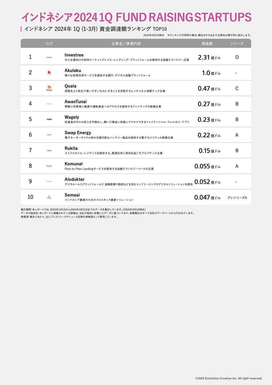 2024年 1Q インドネシア スタートアップ資金調達額ランキングTOP10
