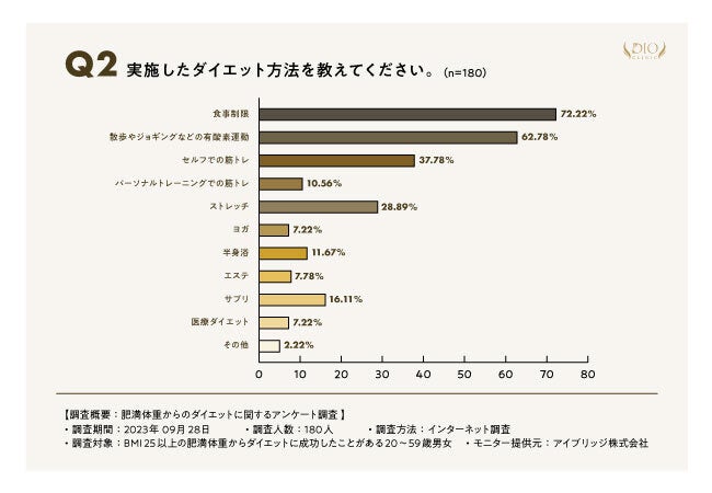 取り組んだダイエット方法としては食事制限(72.22%)が最も多く、有酸素運動(62.78%)、セルフでの筋トレ(37.78%)と続きます。