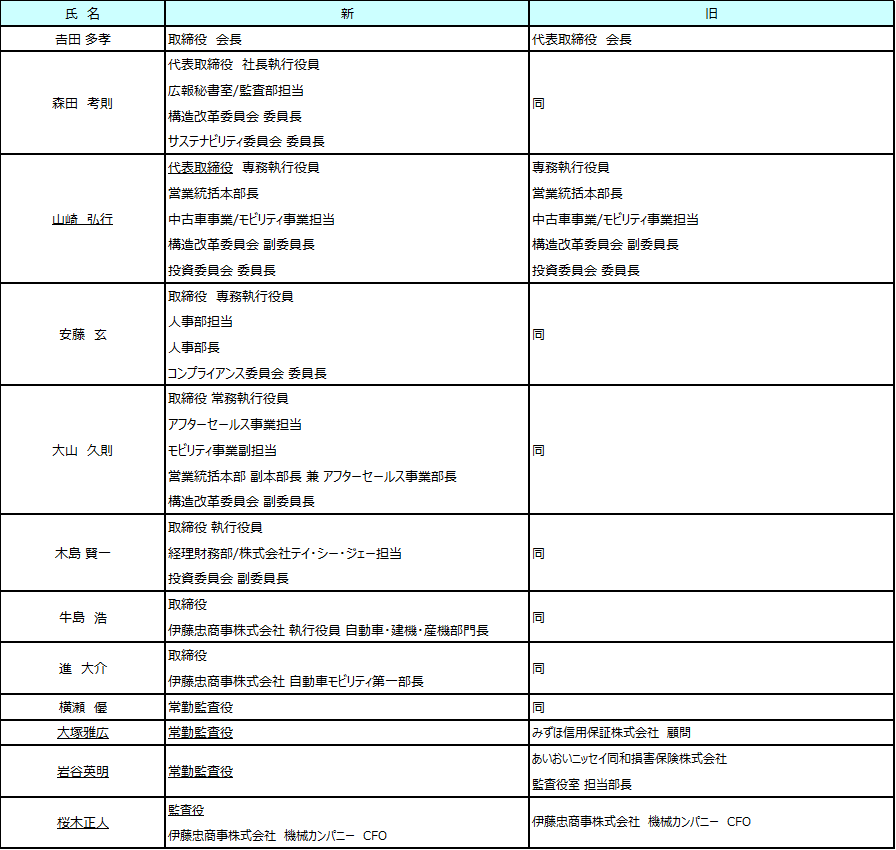 株式会社ヤナセ(社長:森田 考則)は、本日開催の定時株主総会で取締役及び監査役の選任を行った後、取締役会及び監査役会で下記の人事を決定しましたのでお知らせします。