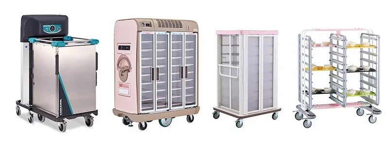 ●大型キャスターにより、移動が簡単に行えます。厨房で再加熱後、食堂に移動しての食事提供が可能です。