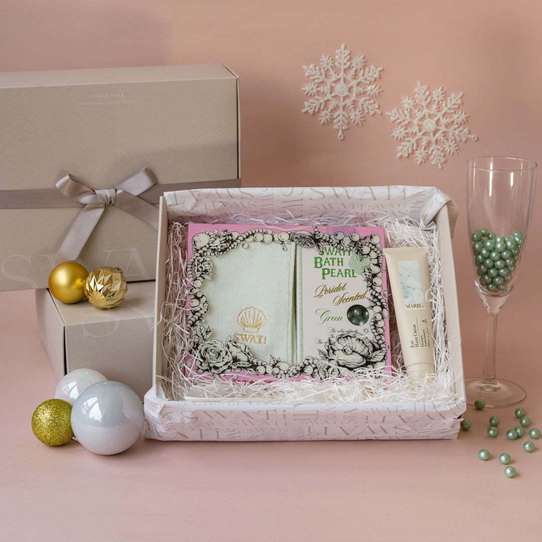 数量限定!SWATiシェルハンドタオルとSWATi BATH PEARL®グリーンを華やかなケースにセットした特別なギフトコレクション。