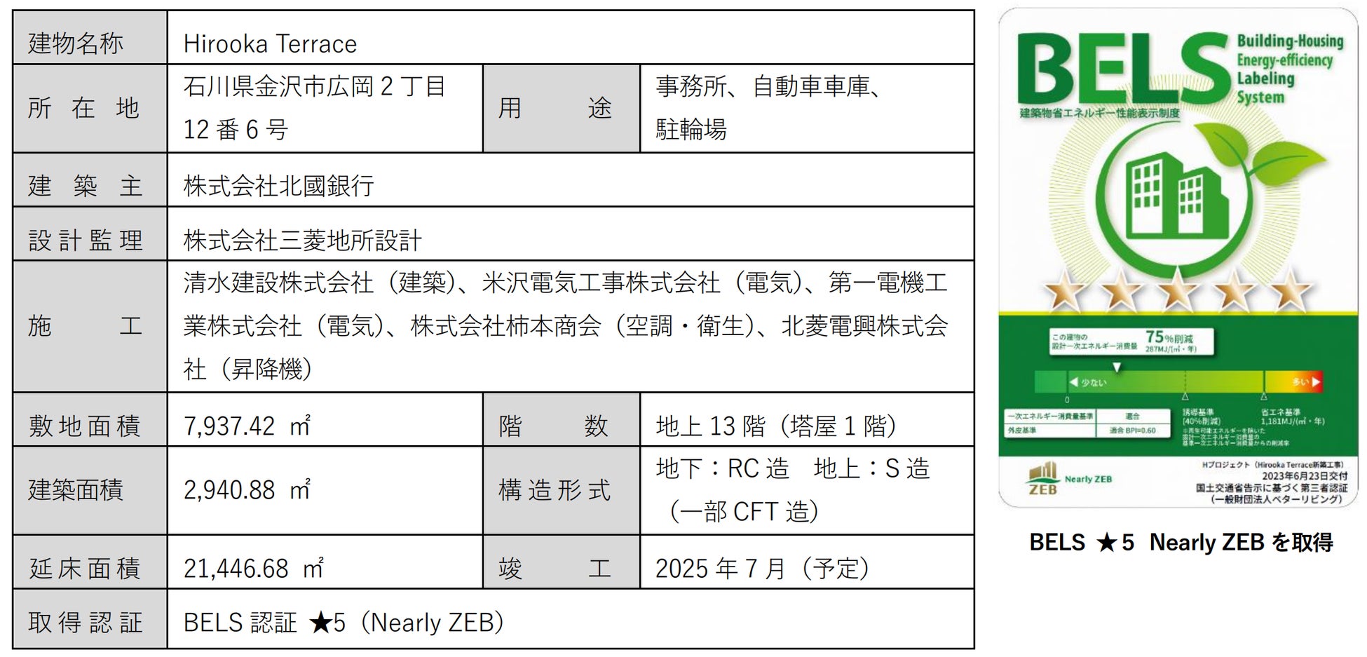 株式会社北國フィナンシャルホールディングス、株式会社三菱地所設計は、2025 年 7 月の竣工を目指し、 石川県金沢市にて建設が進むオフィスビル「Hirooka Terrace」(以下、本施設)が、建築物省エネ法に基づく第三者認証制度である「BELS」認定の最高評価(5つ星)ならびに「Nearly ZEB」を取得しました。