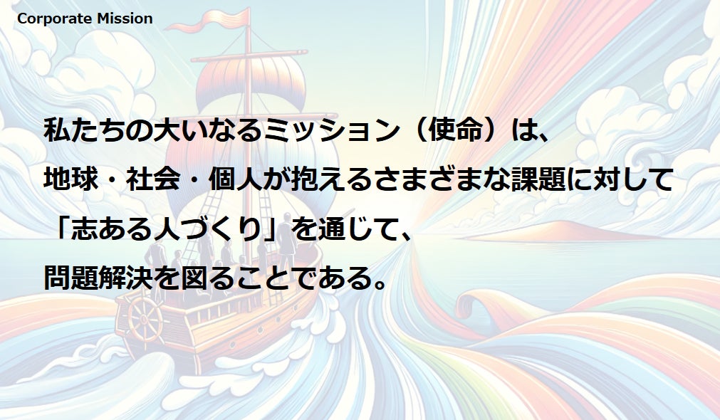 私たちは、顧客と子どもたちに最適なサービス提供を目指し、 同時に、仕事を通じて自らの志を実現するため、常に自分の不完全性を自覚し、 謙虚な姿勢で「学び」を追求するプロフェッショナルであり続けます。 知識と技能の向上はもちろん、人間性の深化をも目指し、生涯にわたって自己研鑽に励みます。