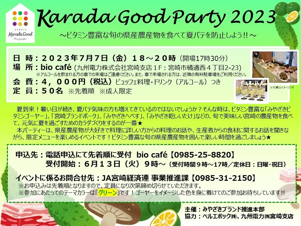 ビタミン豊富な旬の宮崎県産農産物を使った限定メニューを楽しんで夏バテ防止!「Karada Good Party 2023」を7月7日(金)に宮崎市で開催!!
