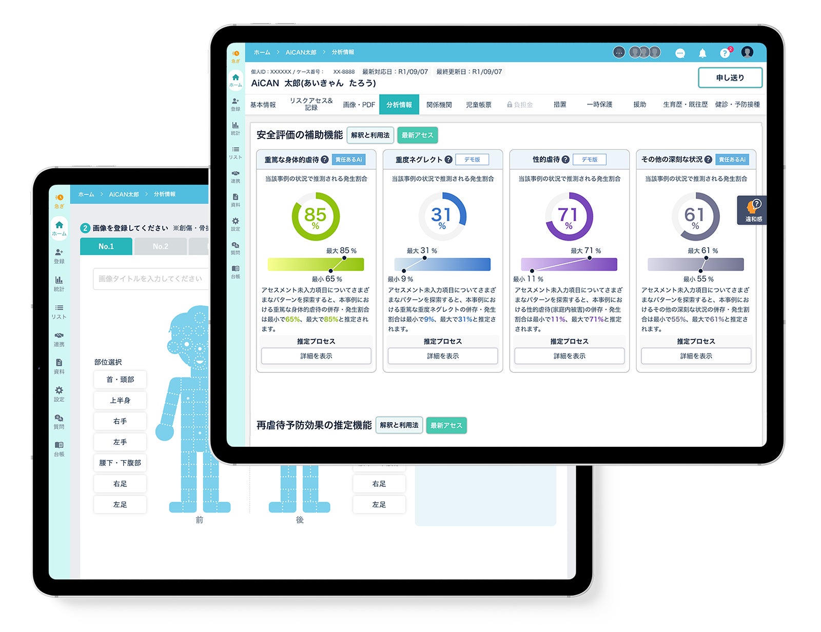 当社は現場の経験知と最新のテクノロジーを融合し、自治体の児童相談所や子育て支援課・母子保健課など、子ども虐待対応の最前線に立つ機関をサポートするサービスを開発・提供しています。