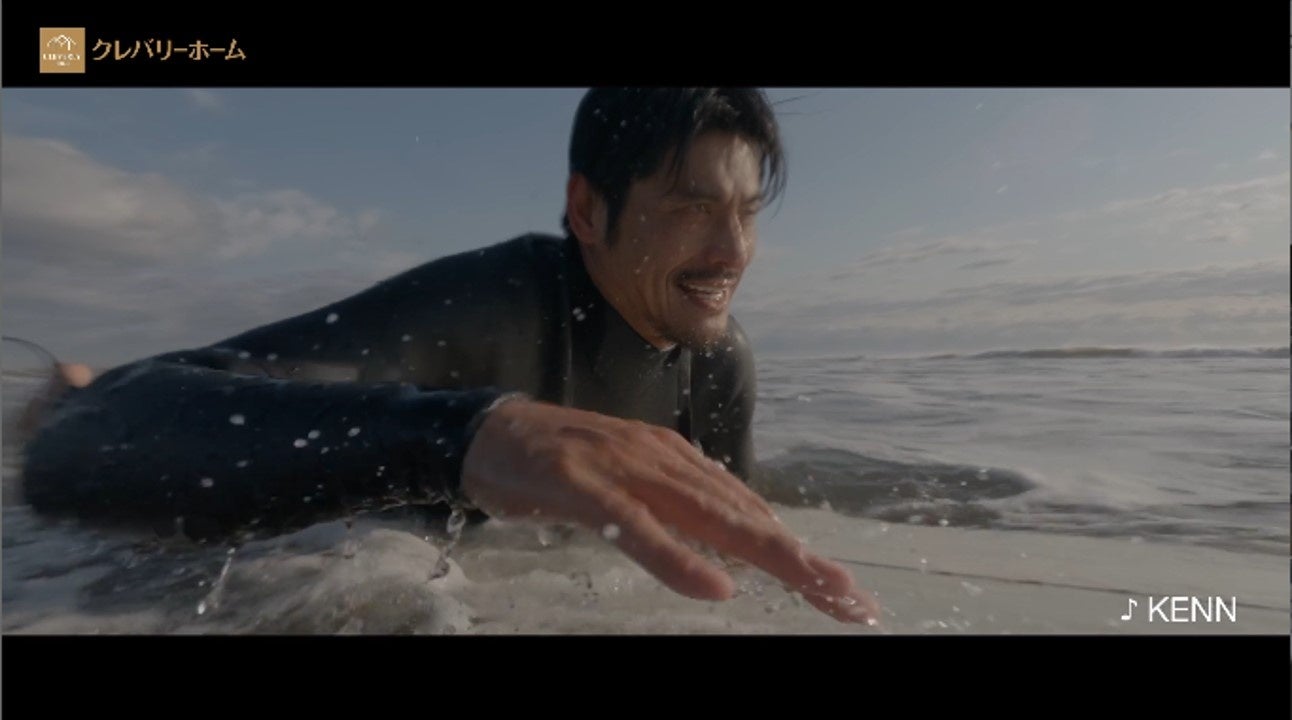 サーフボードを手にウェットスーツ姿で海を眺める坂口憲二さん。海上をサーフボードで進んでいると「流れを決めるのは、いつだって自分。だから安心できる場所は必要。」という本人のナレーションの中、突然の大雨から自宅に避難します。