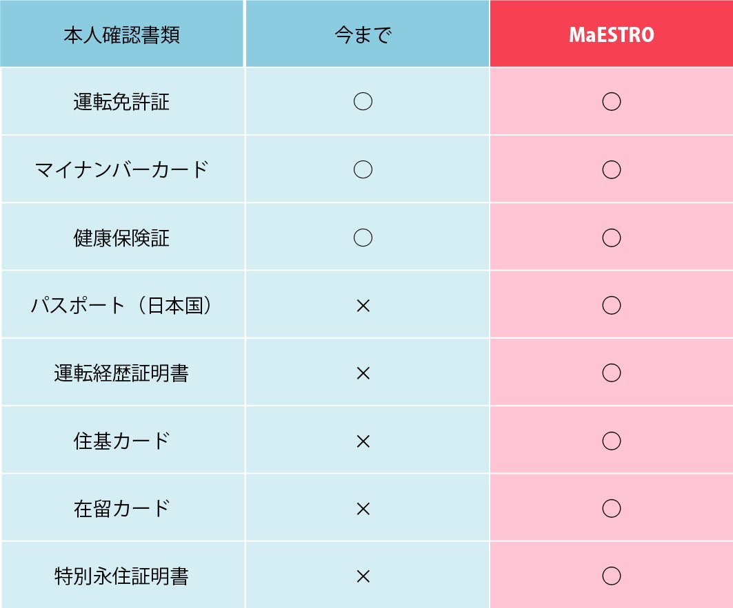 また従来、本人確認にお使いいただけるのは運転免許証、マイナンバーカード、健康保険証の3種類のみでしたが、今回の新システム導入でパスポート(日本国)、運転経歴証明書、住民基本台帳カード、在留カード、特別永住者証明書も含めた8種類に拡大されます。