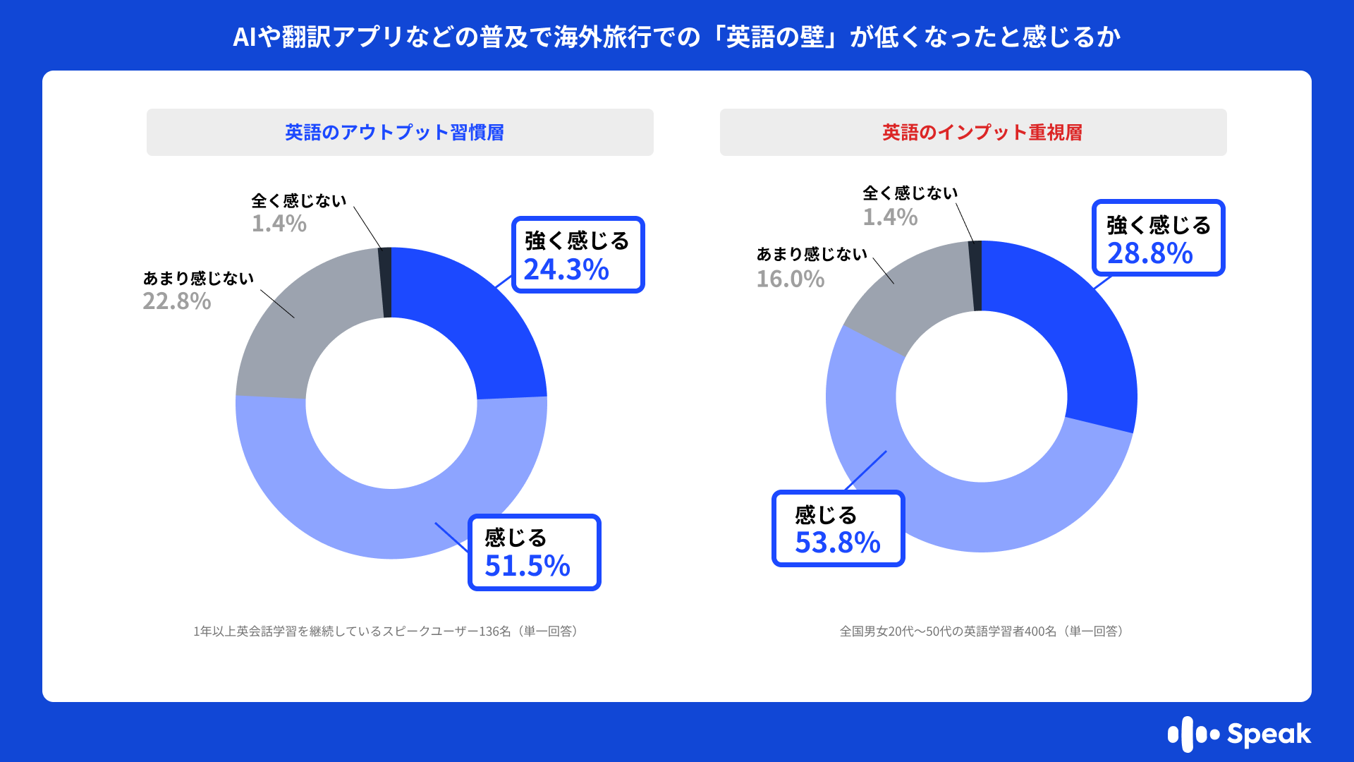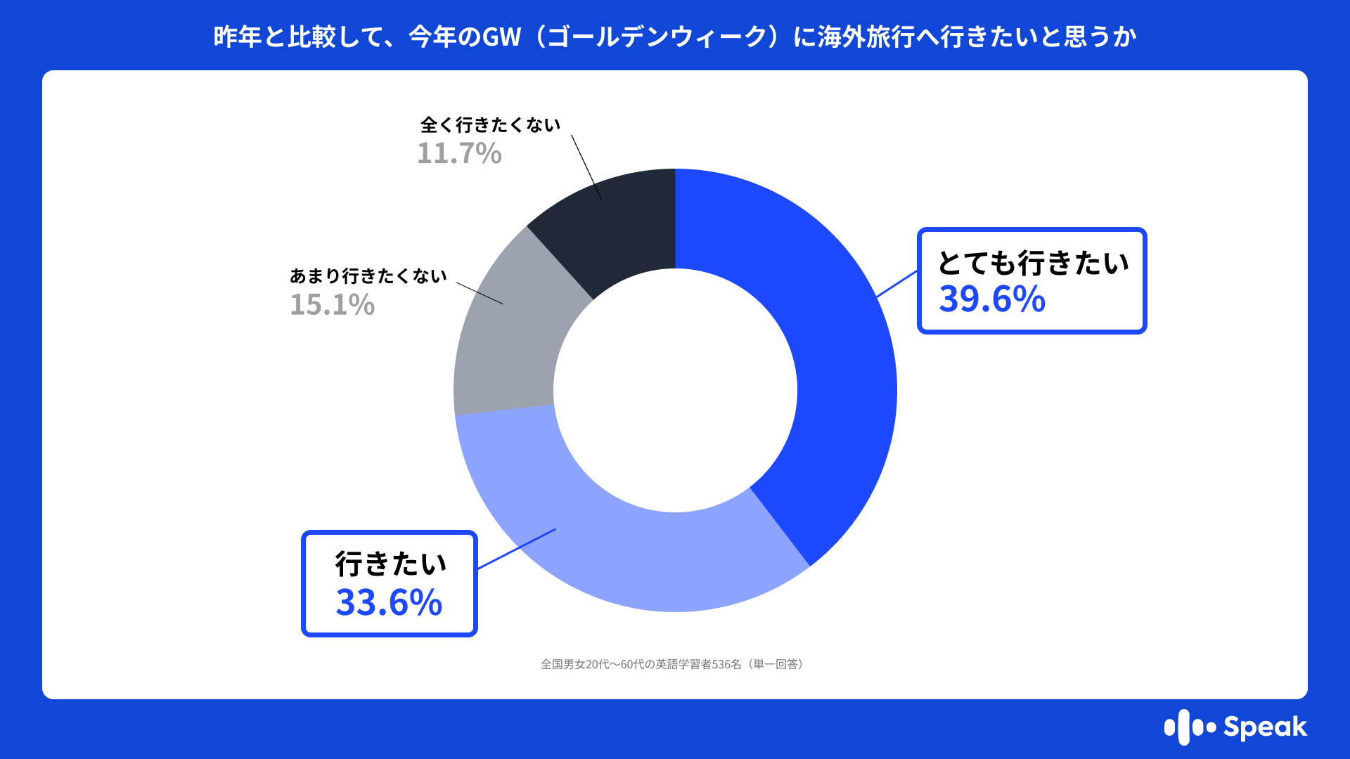 AI英会話「スピーク」(運営:スピークジャパン合同会社)は、最大12連休となる2026年のゴールデンウィーク(以下、GW)を前に、麗澤大学外国語学部教授 森秀夫氏監修の下、英語学習経験者かつ海外旅行経験者計536名(英語のアウトプット習慣層136名 / 英語のインプット重視層400名)を対象に「頭が真っ白『英語フリーズ現象』実態調査」を実施しました。