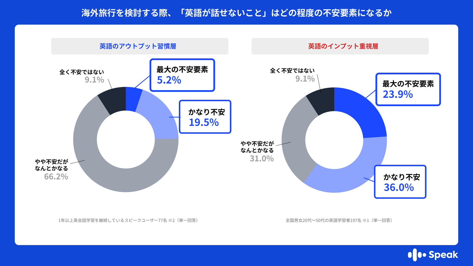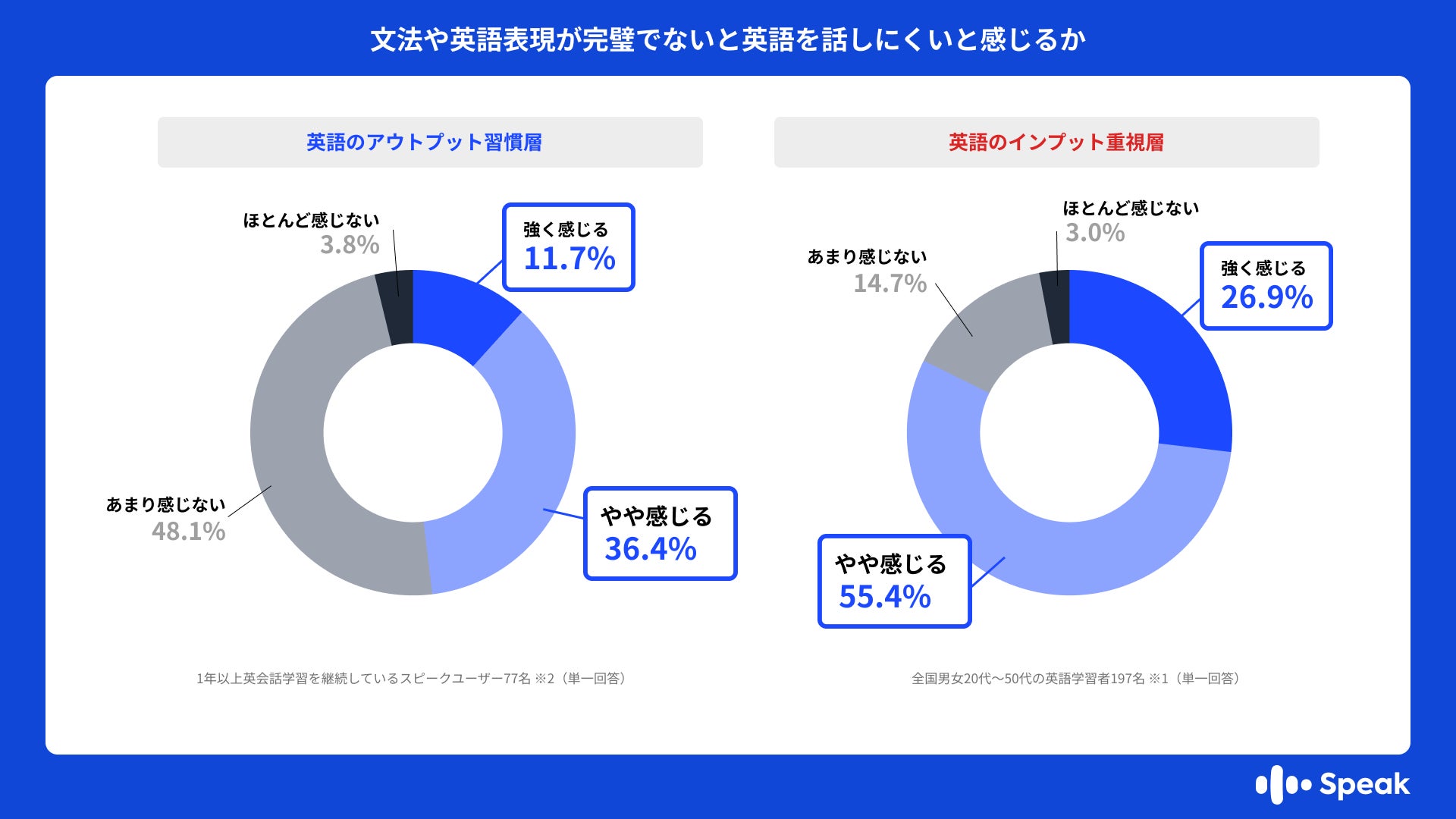 ・一方で、英語のアウトプット習慣層(n=77 ※2)において同様の不安を感じる割合は24.7%に留まっており、両層の間には約2.4倍の深刻な自信の差があることが判明しました。