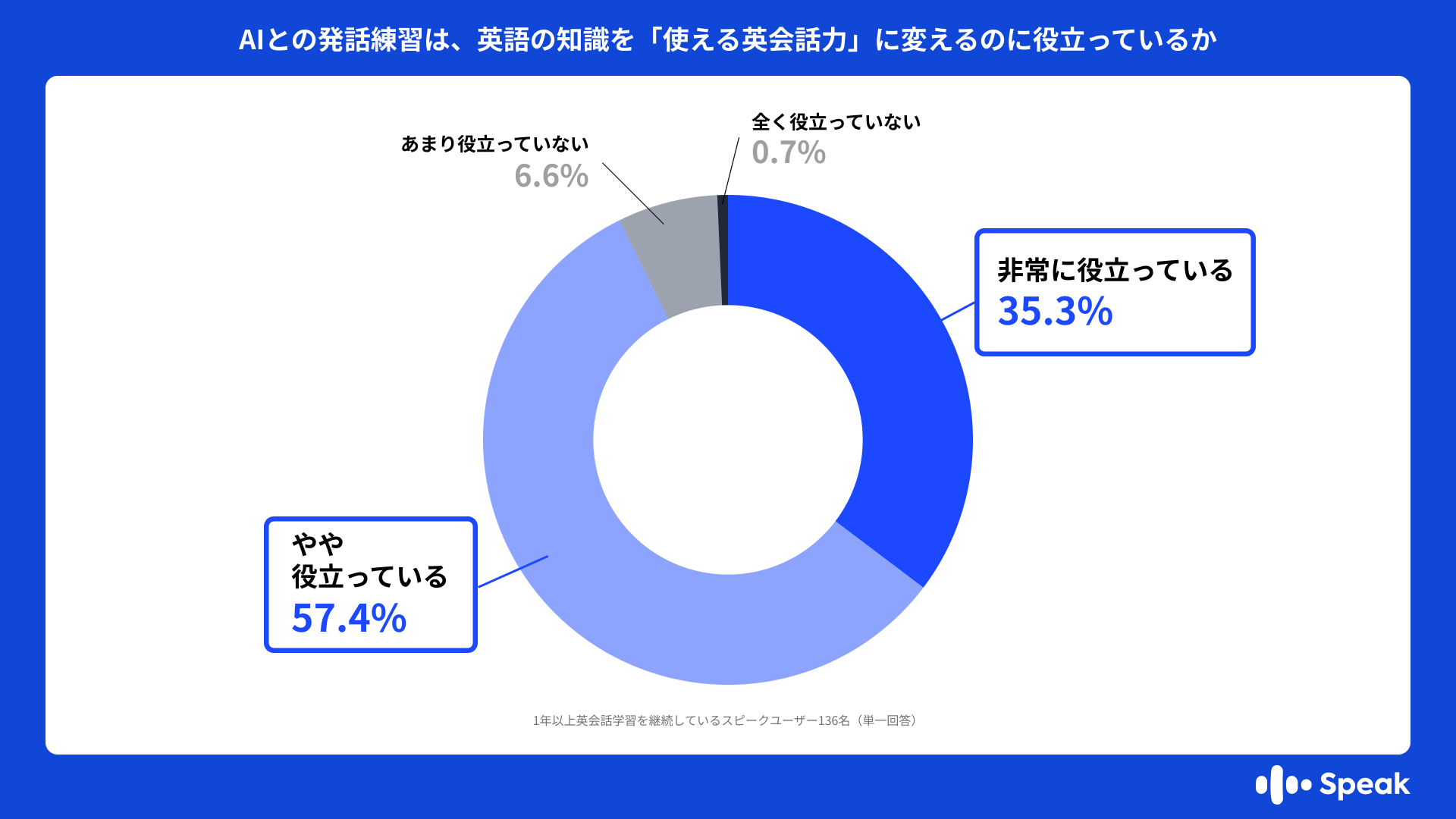 ・1年以上英会話学習を継続しているスピークユーザー(英語のアウトプット習慣層)の92.7%が、AIとの発話練習は、英語の知識を「使える英会話力に変えるのに役立っている」(非常に役立っている+やや役立っている)と回答しており、AIを「練習相手」にすることが『英語フリーズ現象』の軽減に役立つ可能性があります。