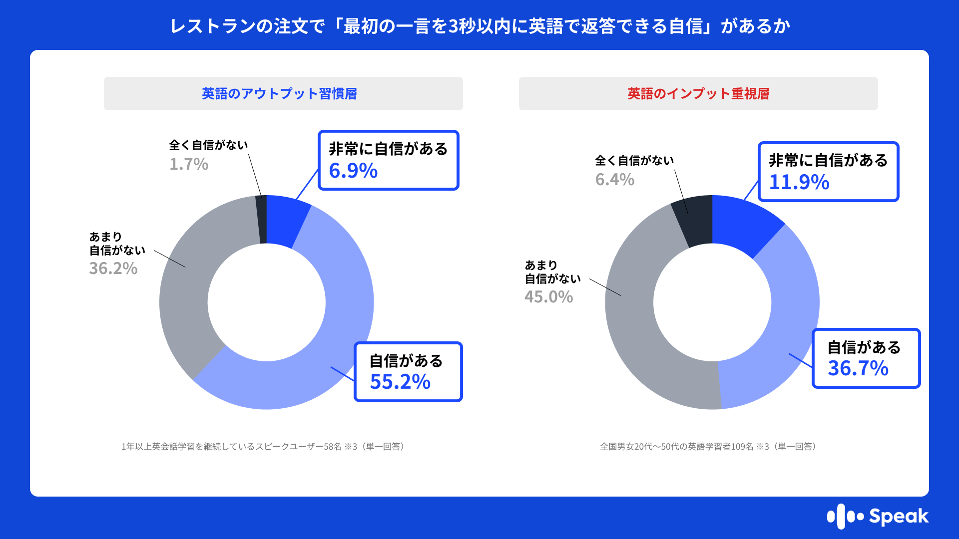 ・英語知識レベルが高校卒業程度と回答した層を比較したところ、レストランでの注文時に「最初の一言を3秒以内に」英語で返答できる自信がある人(非常に自信がある+自信がある)は、英語のアウトプット習慣層(n=58 ※3)で62.1%に対し、英語のインプット重視層(n=109 ※3)では48.6%に留まりました。
