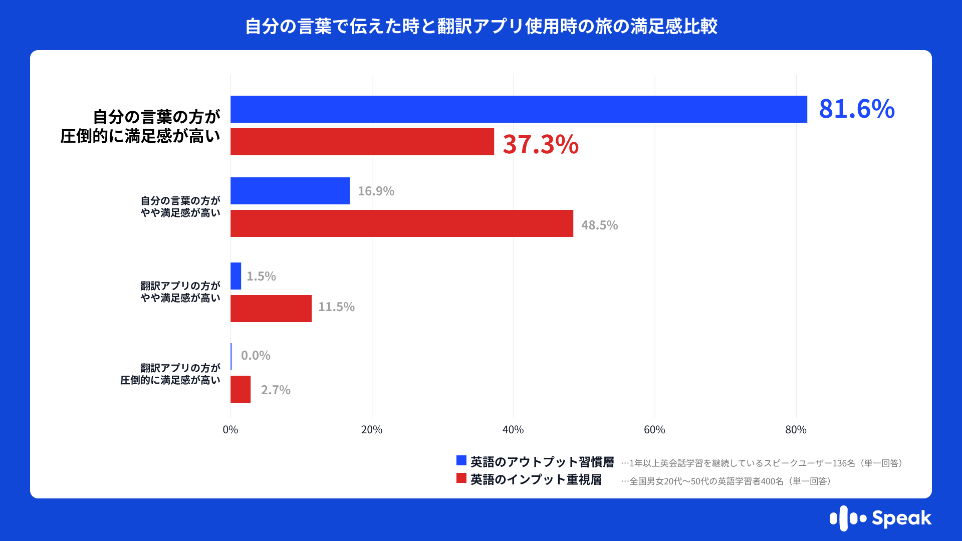 ・自分の言葉で伝えられた時の満足感が、翻訳アプリより「圧倒的に満足感が高い」と答えた割合は、英語のアウトプット習慣層で81.6%に達し、インプット重視層(37.3%)の約2.2倍となりました。