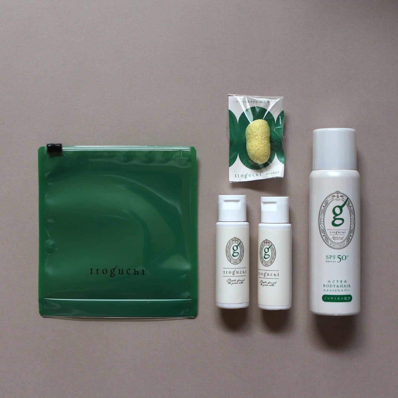 プランをご予約いただいたお客様に、特別に用意された豪華アメニティキットをプレゼント。アメニティキットは「みどりまゆBODY&HAIRモイストシャンプー」名前の通り髪・顔・からだ・デリケートゾーンと全身に使うことができる、Itoguchiの代表製品。みどりまゆシルクを高配合し、髪やからだにうるおいを残す処方のため、トリートメントやボディミルク不要の仕上がりに。スキンケア発想の全身用シルクモイストソープ。その他UVスプレーなどのキット、シルク仕込みスキンケア トラベルセットもご用意。