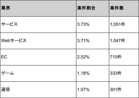 業界別に見ると、サービス業界3.73%、Webサービス3.71%、EC2.52%が上位を占め、ユーザー接点の多いオンラインサービス領域で特に需要が高い状況です。