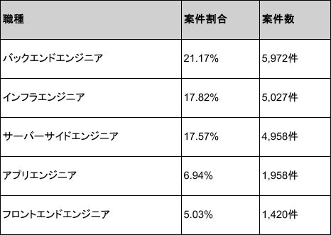 次いでアプリエンジニアが6.94%(1,958件)、フロントエンドエンジニアが5.03%(1,420件)と続いています。これらはバックエンド系職種と比較するとやや少なめですが、それぞれ相当数の案件があり、一定の需要が存在することを示しています。
