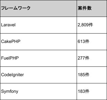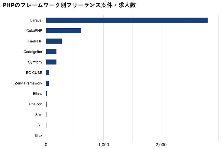 PHPフレームワークの中で、LaravelやCakePHP、FuelPHPなどが特に多くの案件数を持ち、市場シェアを拡大し続けています。