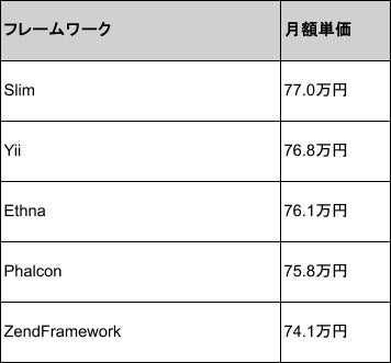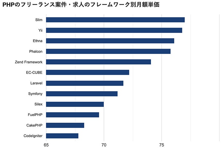 PHPフレームワークの中でSlimが最も高い月額単価を示しており、77.0万円となっています。続いてYiiが76.8万円、Ethnaが76.1万円、Phalconが75.8万円、そしてZendFrameworkが74.1万円と続いています。