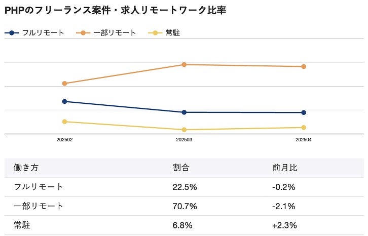 2025年5月時点でのPHPフリーランス案件・求人のリモートワーク比率はフルリモートが22.5%、一部リモートが70.7%、常駐が6.8%です。