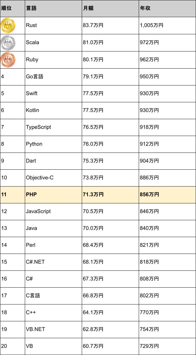 PHPプログラミング言語案件の平均年収は856万円で、プログラミング言語年収ランキングでは11位に位置しています。これは、PHPが依然として案件数・利用実績ともに豊富である一方、年収面では上位言語ほどの高単価には届かないことを示しています。