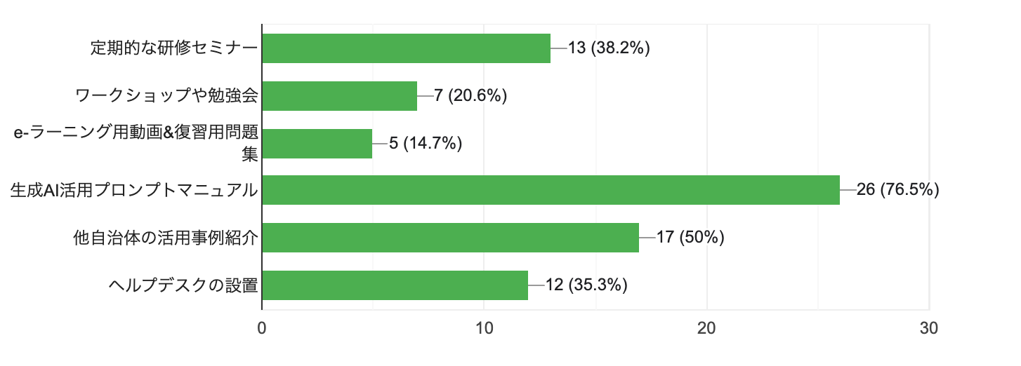 これらの結果から、生成AIの効果的な活用には、具体的なマニュアルと成功事例の共有が重要であることが分かります。これにより、職員が生成AIの活用方法を理解しやすくなり、自信を持って導入・活用することが可能となります。