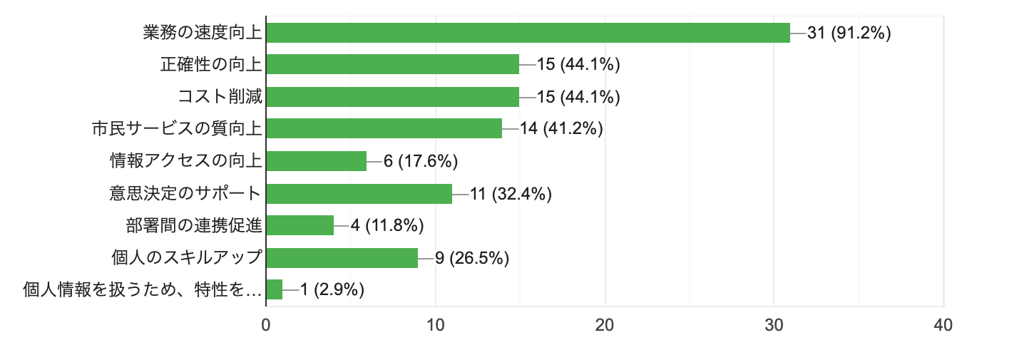 生成AIの導入に対する期待は、業務の迅速化を通じた職員の負担軽減と同時に、市民サービスの質を高めることにあることが分かります。