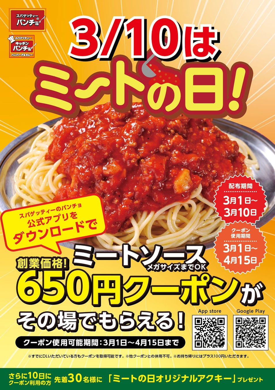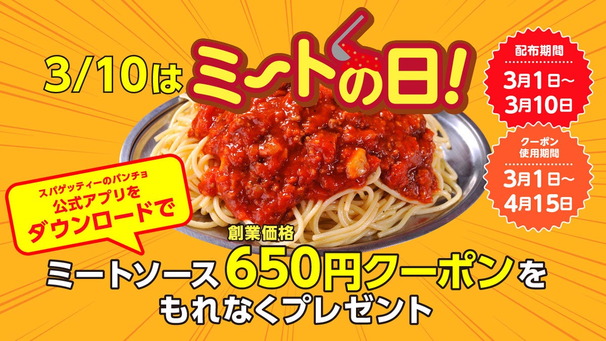 パンチョではミートソースの日を記念し、2024年3月1日(金)から3月10日(日)まで「ミートの日キャンペーン」を開催。今年は公式アプリ内でミートソース限定クーポン配布や、当日には各店先着で限定グッズをプレゼントします。
