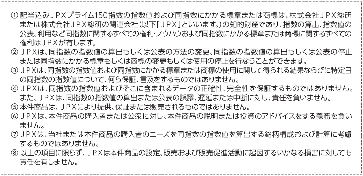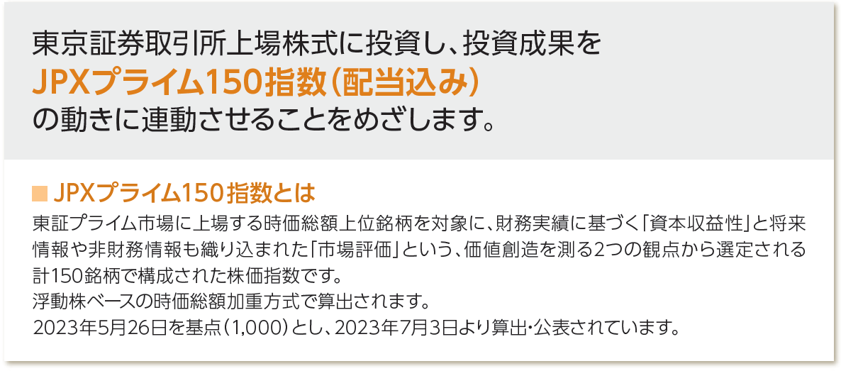 東京証券取引所上場株式に投資し、投資成果をJPXプライム150指数(配当込み)の動きに連動させることをめざします。