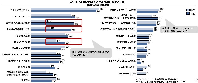 インバウンド観光客受け入れの課題を現在と将来で比較をすると、いずれも人手不足・人材不足が最大の課題となっている。