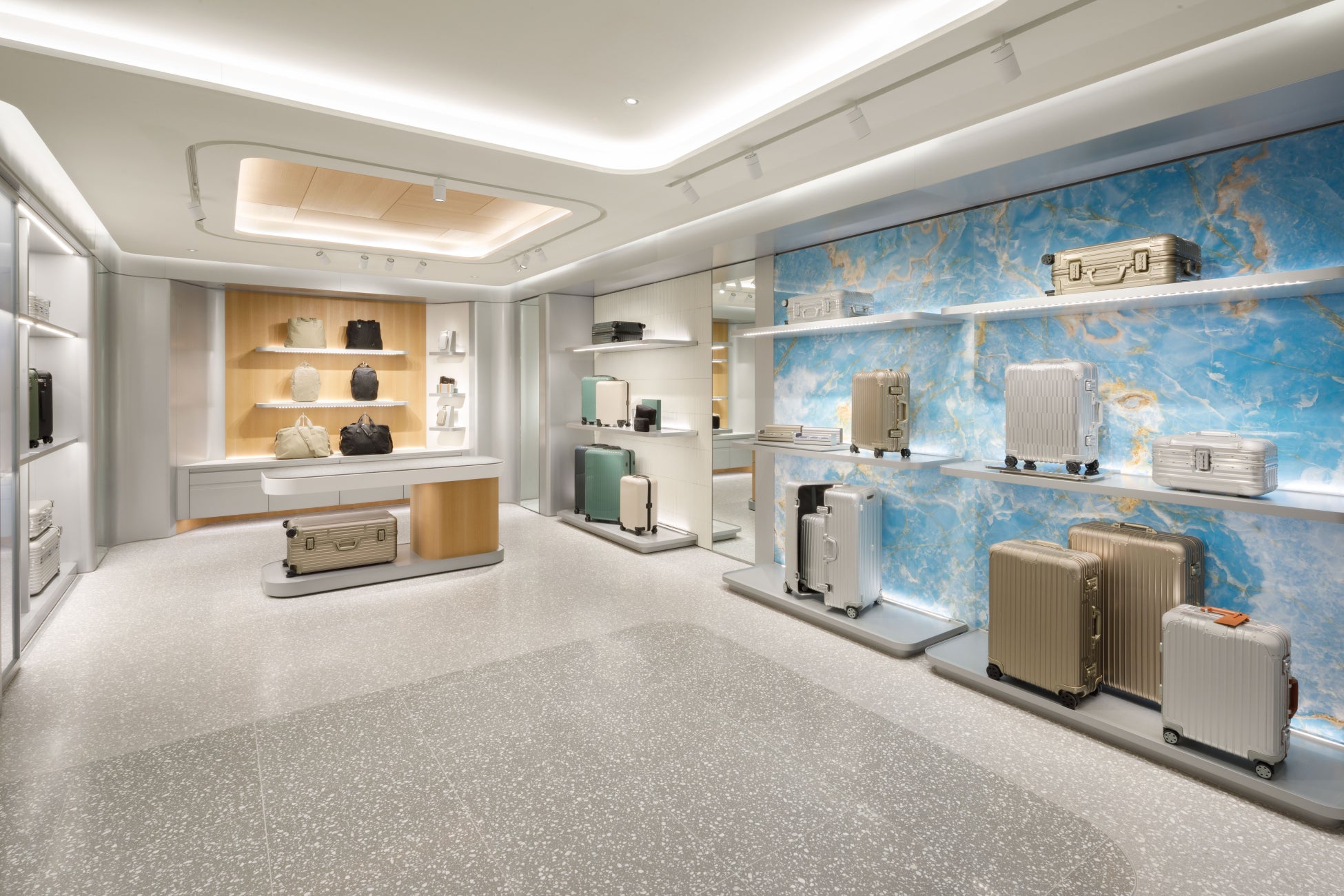 1階と2階に分かれた売り場は、総面積350㎡の広々とした空間が広がります。シンプルで洗練された世界観を打ち出すRIMOWAのストアコンセプトにプラスして、心斎橋店では「水の都 大阪」をイメージした独自のインテリアが取り入れられています。店内の一部壁面には、青と白とのカラーコンビネーションが美しいブルーオニキスを採用。自然界が作り上げた絶妙な青と白との組み合わせは、西の商業の中心地として多くの船が行き交い、水面に白波が立つ「水の都 大阪」の情景を彷彿とさせます。