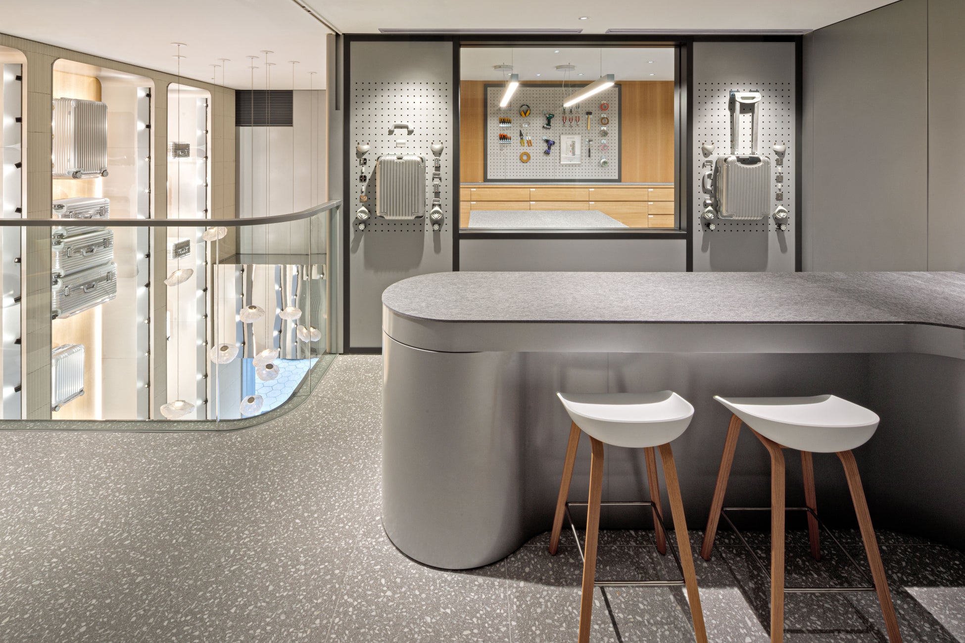 エントランスを入るとすぐに現れる吹き抜け部分に設けられた「Originalコレクション」のためのレンジウォールや、「Essential」コレクションの豊富なカラーラインナップを一同にディスプレイすることが可能なカラーレンジウォールなど、ゆったりとした空間を最大限活用したダイナミックなディスプレイツールは、訪れる方々を大胆なRIMOWAの世界へと誘います。また、2階のクライアントケアセンターはガラス張りで仕上げられており、RIMOWAの卓越したクラフツマンシップを間近にご覧頂くことができます。