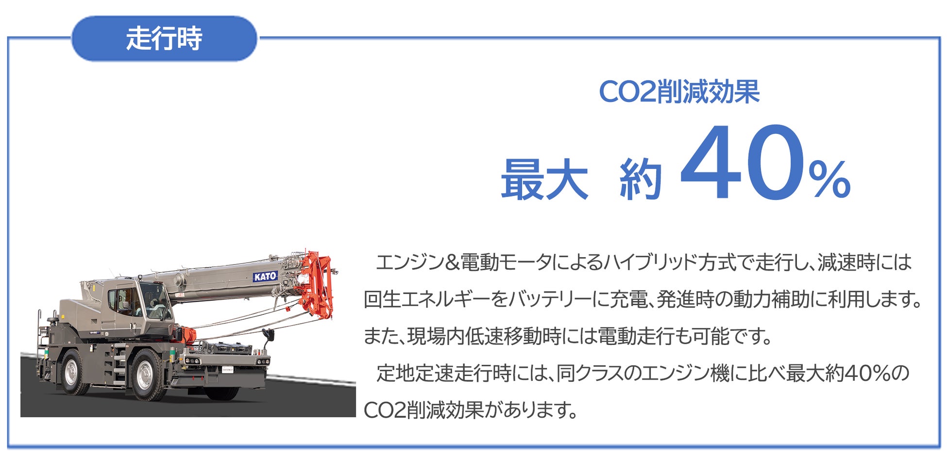 こうした状況を踏まえ、当社では「適正な価格で、充電切れの心配がなく、CO2排出量削減が可能なクレーン車」を目標に研究を進めました。その結果、従来のディーゼルエンジンに加え電動モータを装備したハイブリッド式ラフテレーンクレーン(ハイブリッドラフター)が、現在の日本市場においては最適な製品であると判断いたしました。